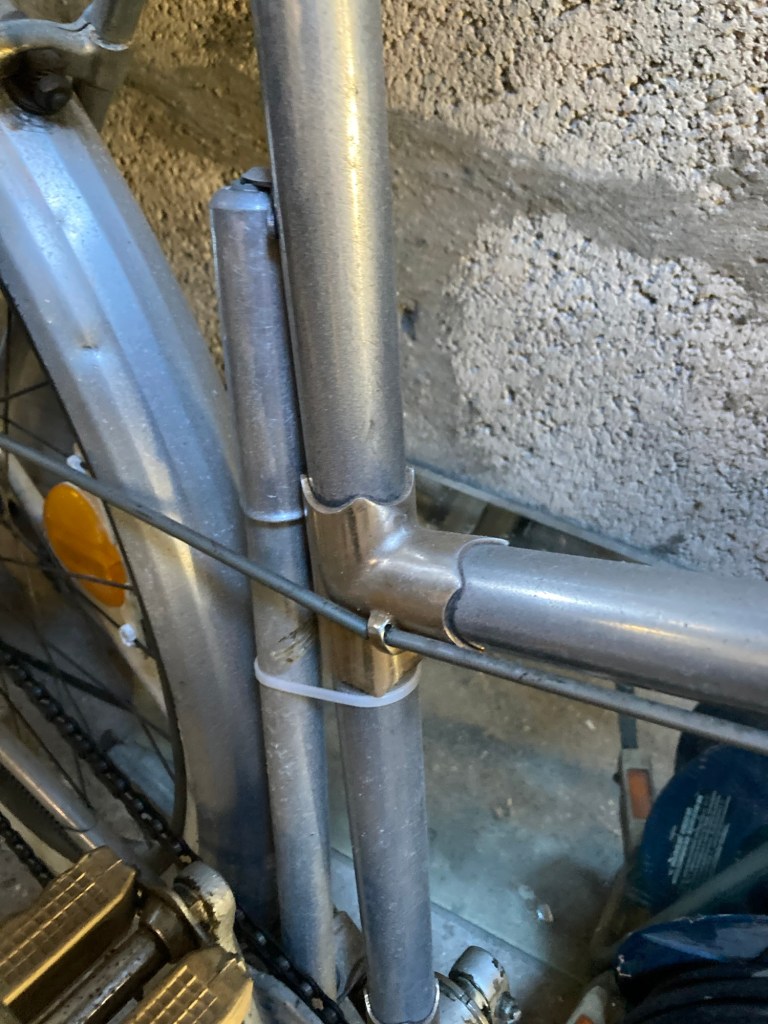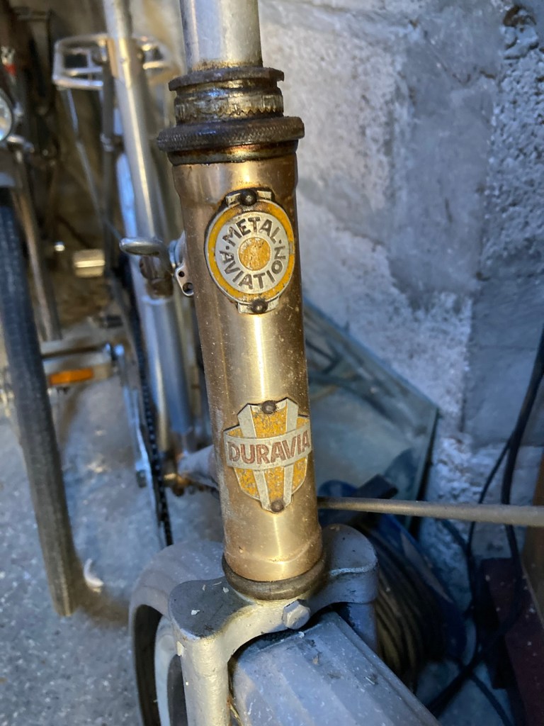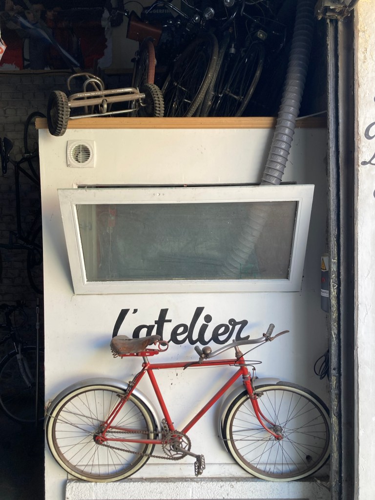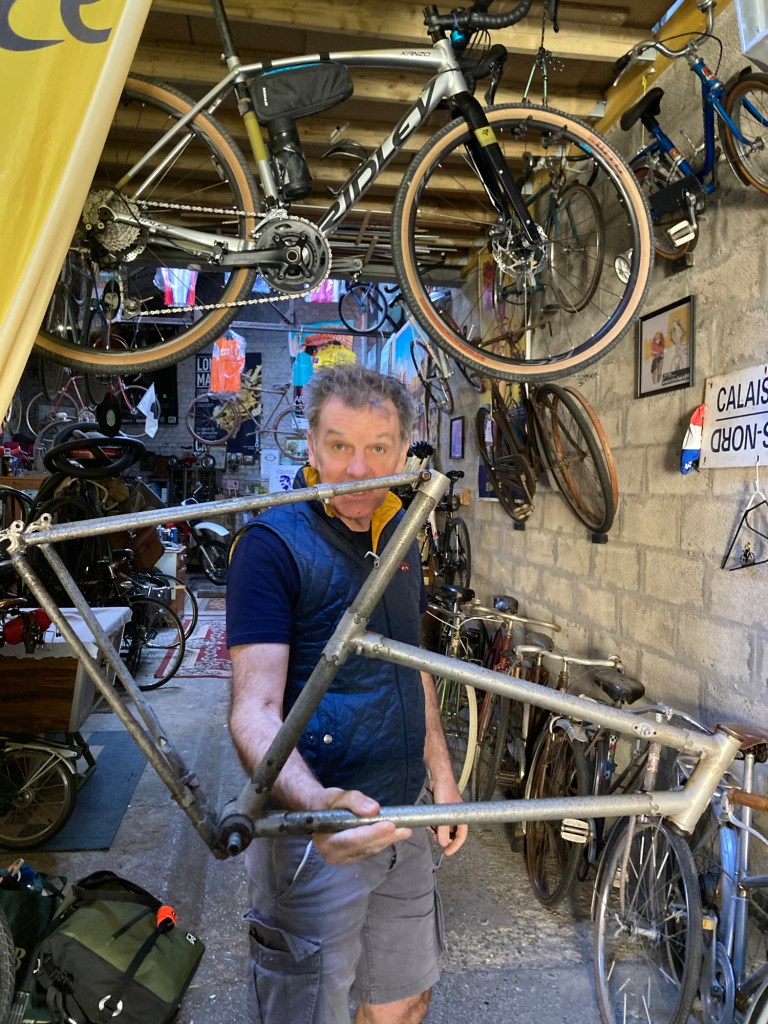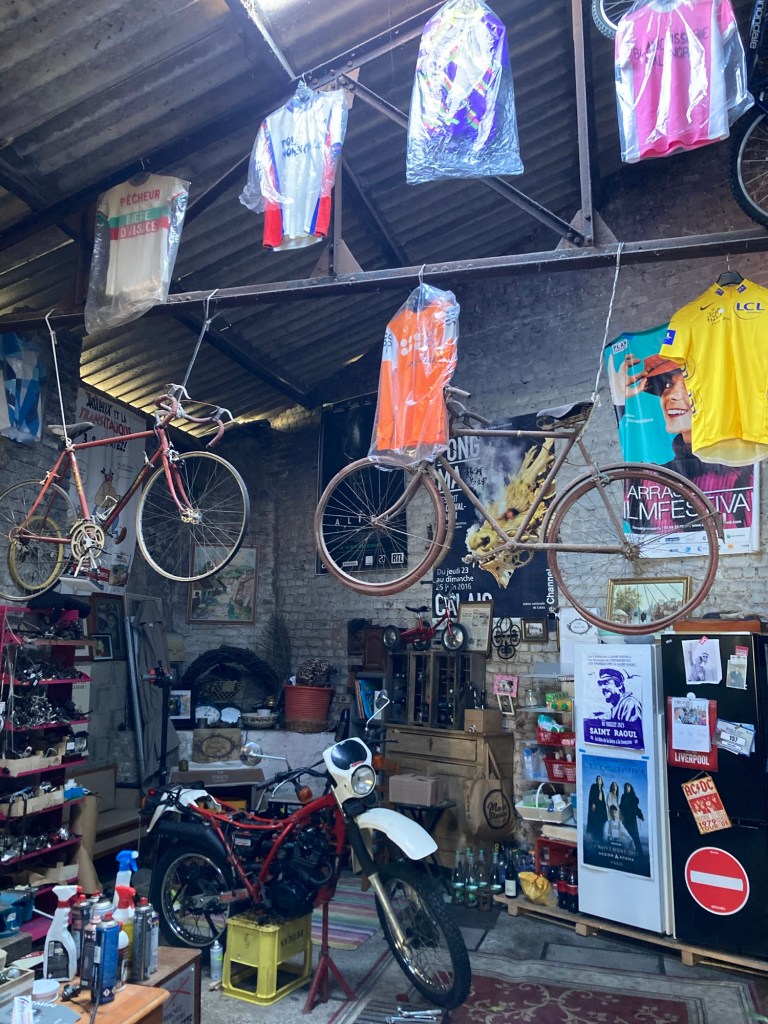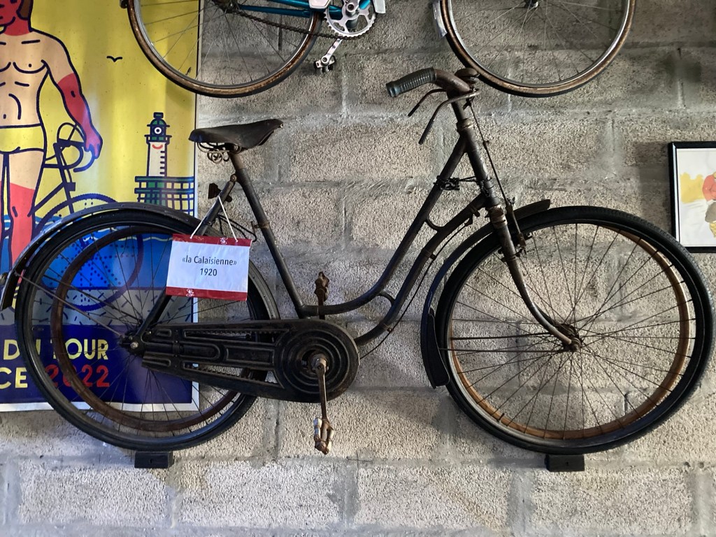 Mais d’abord, le départ… la veille j’étais un peu en avance, quand j’ai débarqué au gîte après avoir erré dans les zones commerciales entre Calais et Sangatte. Mon hôtesse m’a donc demandé de passer par le garage où son mari me laisserait une clef. La porte passée, j’ai atterri au paradis du vélocipediste. Des vélos du sol au plafond, un maillot jaune géant suspendu à mi-hauteur. Le monsieur, ancien contrôleur tgv, a laissé libre cours à sa passion de la retape de petite reine quand ils ont acheté la maison. Le matin du départ, il me fait la visite. J’admire un cadre vissé conçu par un avionneur, (la région était en fait pleine de petites manufactures de vélo et d’avion). Il met spontanément de côté un cadre en alu des années 30, à retaper, pour la fois où mon fils passera par là. Une calaisienne pour les dames qui roulaient sur la digue, des courses, et même une moto. On compare les mérites du vélo de gendarme et du vélo de facteur. On s’attarde brièvement sur les cahots de la vie professionnelle. On parle du plaisir de rouler avec ses enfants, de la confiance et du lâcher-prise pour rouler en tandem. On se sert la main, « faites attention aux autres sur la route ».