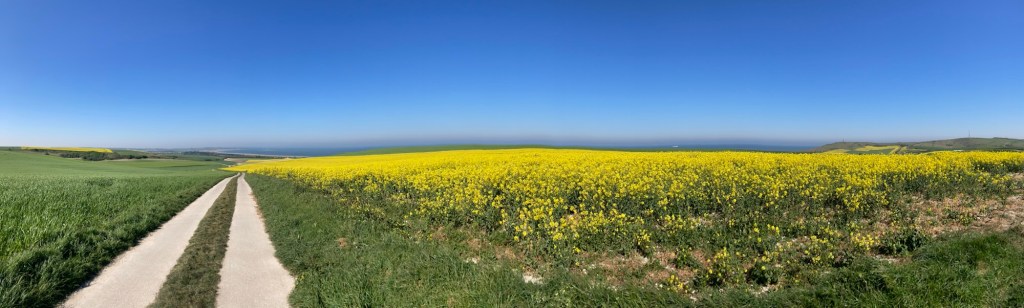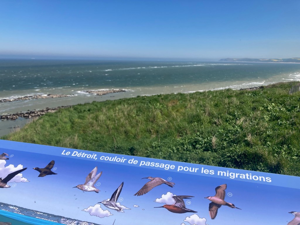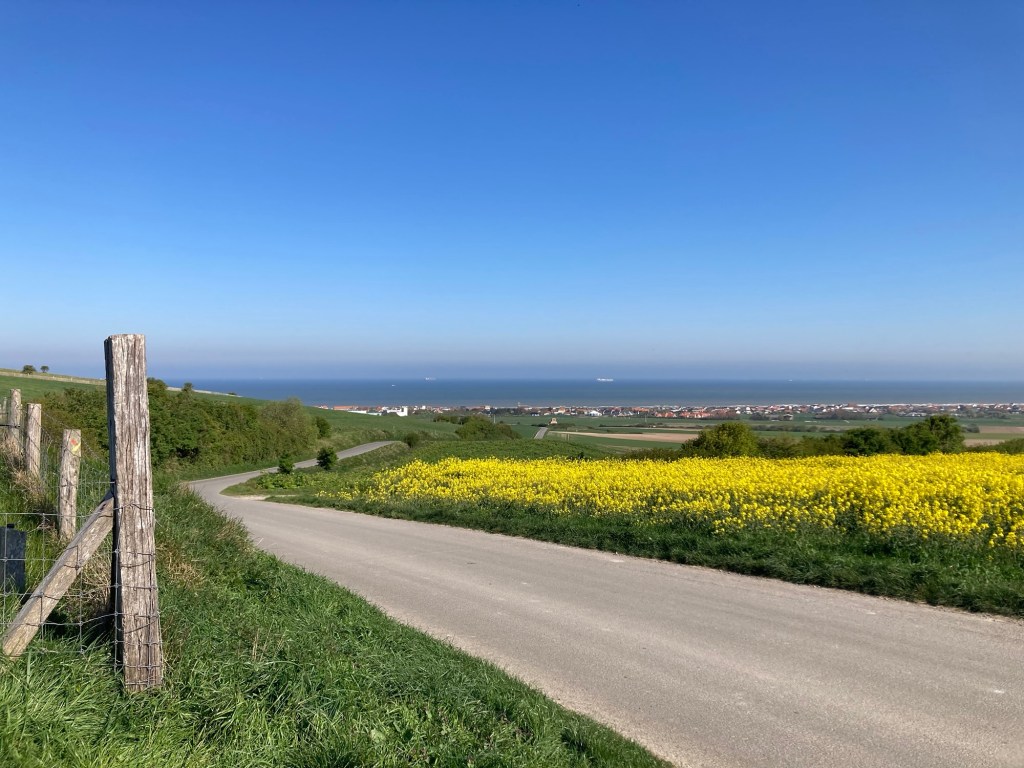 Partir mais s’arrêter avant d’attaquer la première montée en se prétextant à soi-même un changement de veste. Première côte, réveils du souffle, des cuisses, des genoux, du dos. Regarder la mer vu de haut, les pieds sur terre. Le ballet des ferrys devant Calais. Les houles de jeune blé. Combien faut-il d’hectares pour nourrir une personne ? Dans la descente vers Wissant, je frôle les 50 km/h. Bromit ne fait pas le fier. Je cherche des tracteurs marins mais le seul que je trouve est encore dans son paquet cadeau bleu pétard. Appeler mes parents face à un beau souvenir iodé. Cinétique appliquée : pour bien monter, il est conseillé d’avoir vite descendu ; sinon… casse-pattes. Au cap Gris Nez, sur terre et sur mer, des moutons et des moutons. Sensation écossaise fugace. Un panneau de l’UE de très mauvais goût décrivant un « détroit de migrations », évoquant de superbes oiseaux, sans aucune mention humaine.
