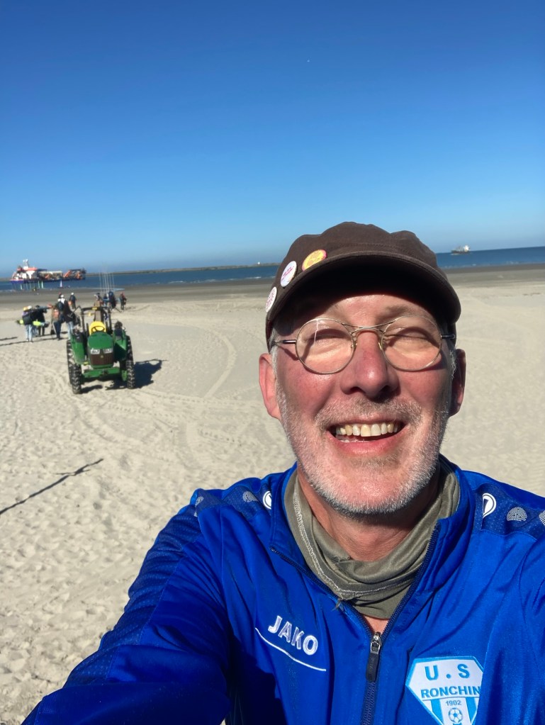 Depuis le haut de Terlincthun, je fais un « pédaler, c’est tricher ». Je dévale la côte jusqu’à Boulogne, je réussis à arriver au cœur de la ville face à un beau tracteur marin sur la plage.