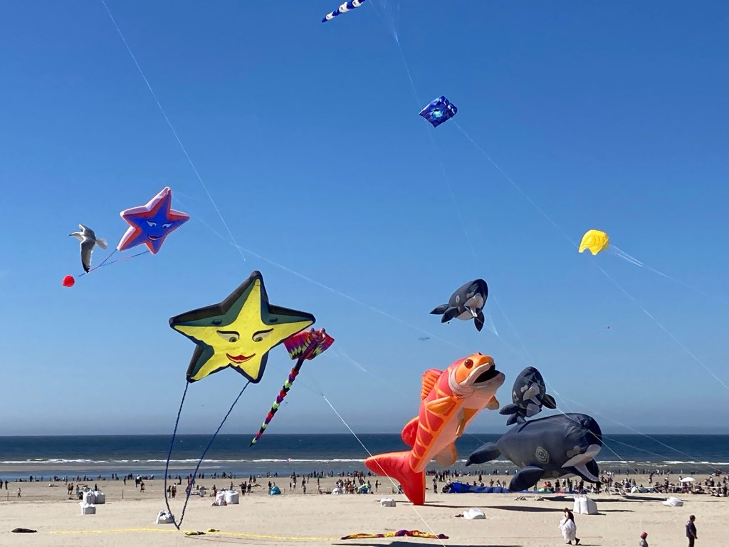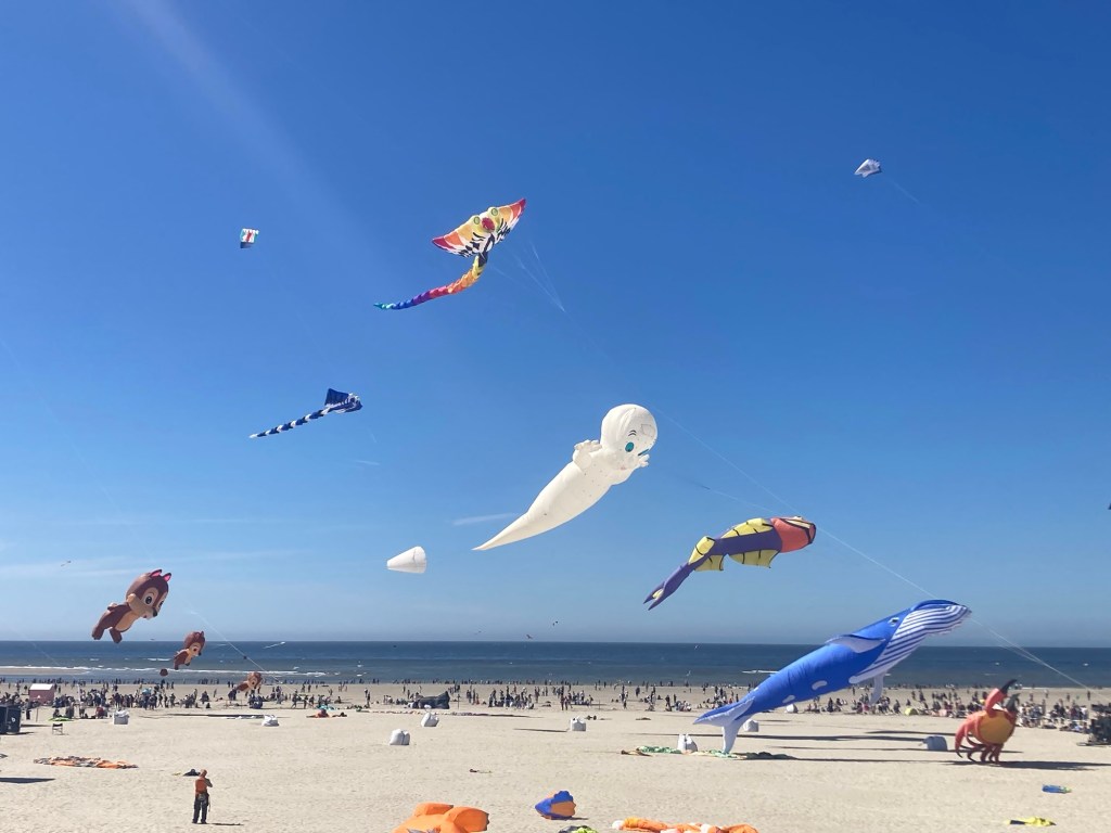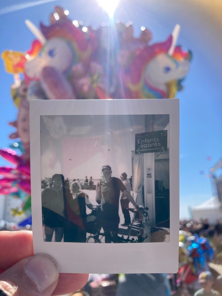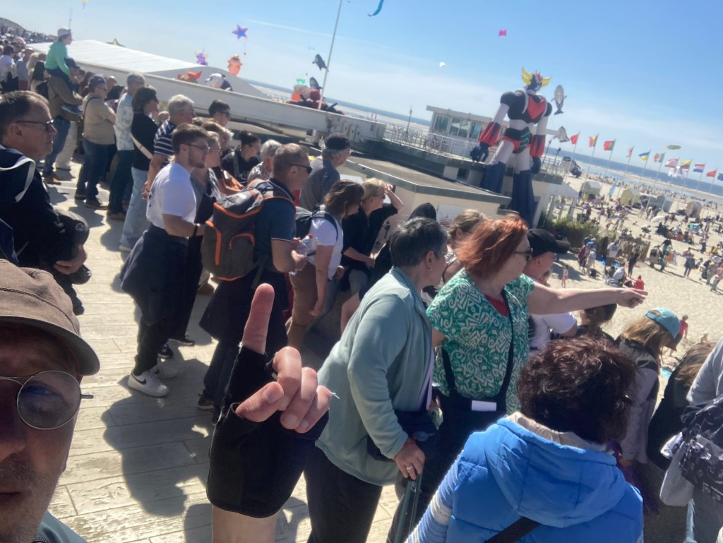 Puis j’arrive à Berck et son festival mondial de cerf-volant. Un commentateur égrène les règles du cerf-volant synchronisé, c’est l’équipe du Canada qui passe alors que j’arrive à la digue. La plage est noir de monde, je flâne. Je salue un Goldo gonflav. Bromit va au pas.
