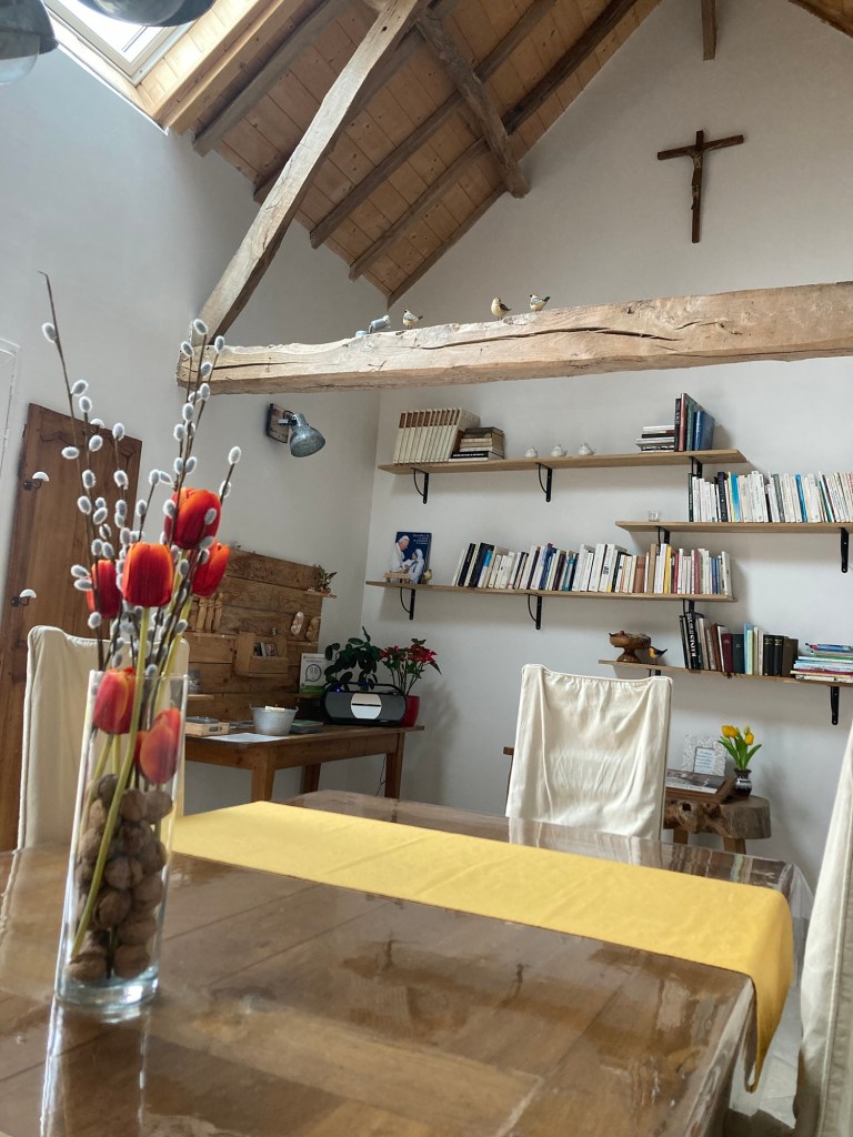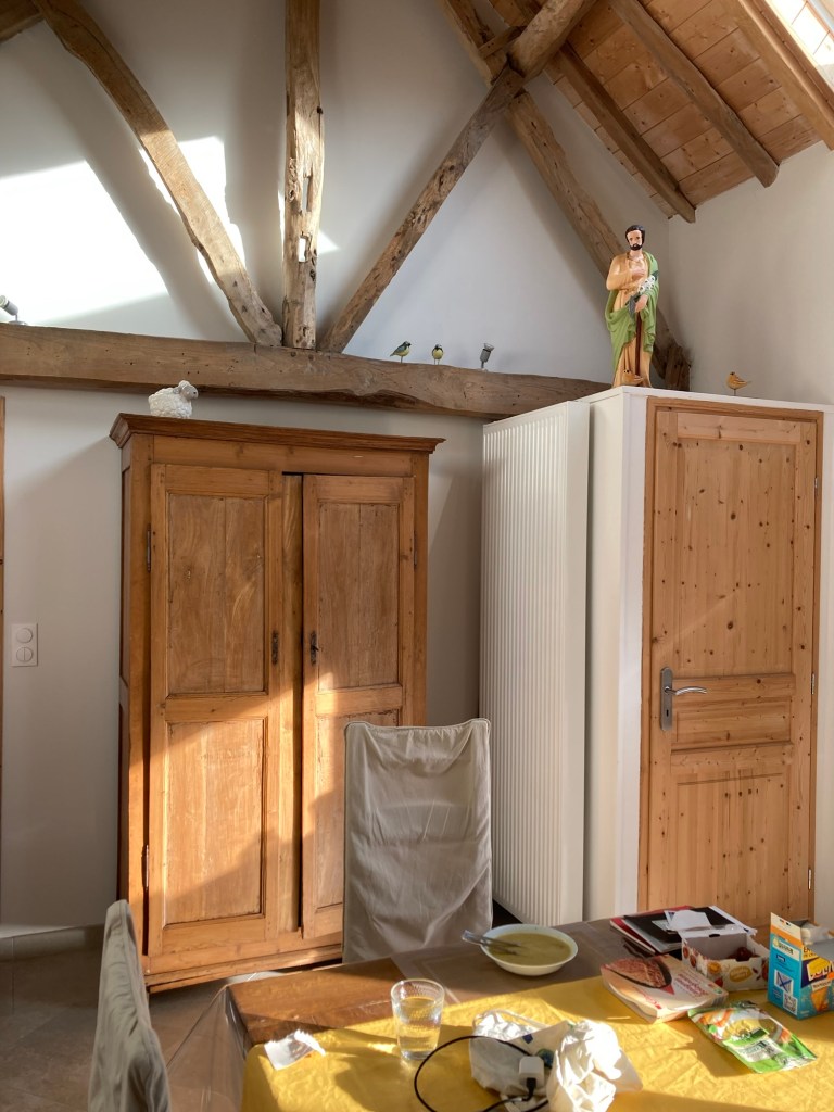 Je suis accueilli aux Chambres Saint-Joseph, l’homme qui m’accueille porte une petite croix de bois. L’établissement est une ancienne menuiserie d’où le nom du gîte choisi par le diacre, une petite chapelle est au fond de la cour où les gens du village peuvent venir prier à tout heure.